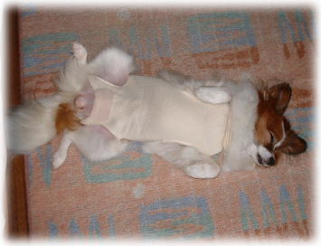 | 術後着。 エリザベスカラーより快適? 暫く、着ている内に、本人はお気に入りに・・・ |