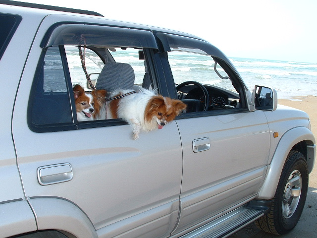 | 実は・・・ この二人は海が苦手なんです。 車に乗って記念撮影。( ̄。 ̄)ホーーォ。 |